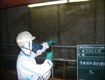 弊社独自のエコベスト(飛散防止剤)を吹き付けて、人体に危険なアスベストを安全・迅速・低コストにて含浸固化する技術、「CAS(キャス)工法」を開発いたしました。